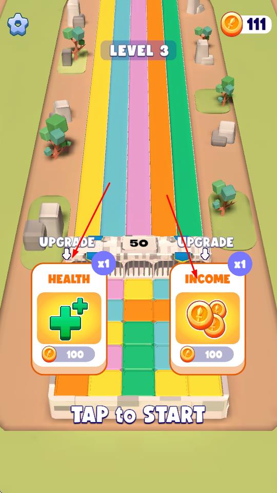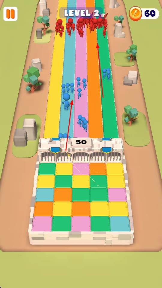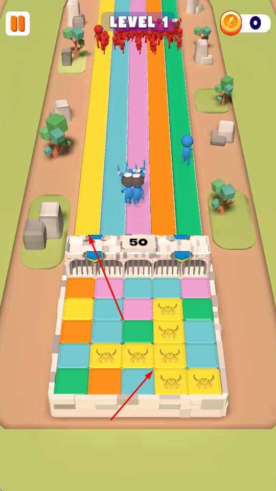 1、砖块消除召唤小兵:进入战斗场景后,快速点击消除屏幕上的颜色砖块,对应跑道会立即召唤出相应小兵,需观察敌人进攻方向,优先在关键跑道消除砖块。