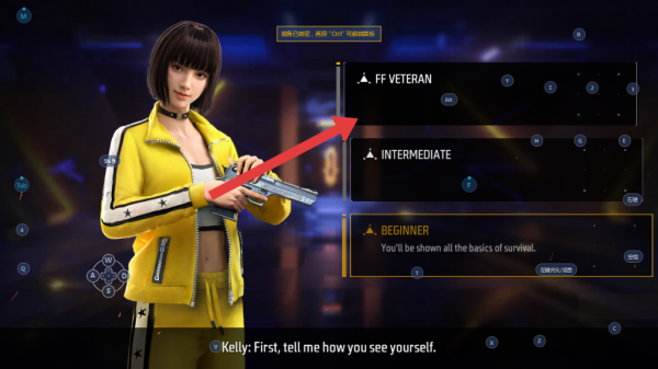 1、在新手选择界面,点击【FF-VETERAN】,选择资深玩家难度,跟随Kelly开始《Free-Fire》冒险。