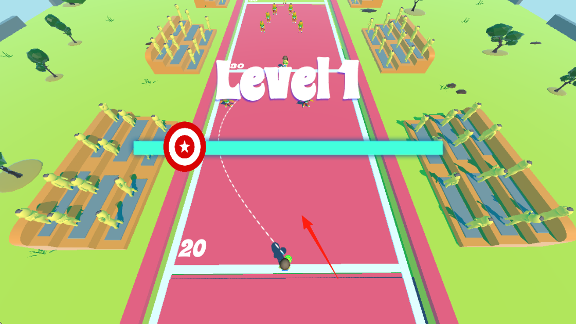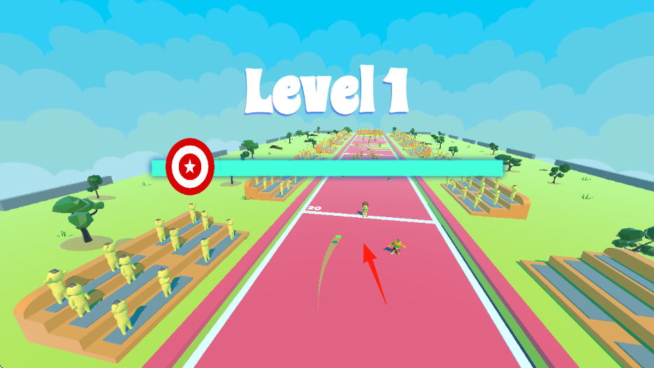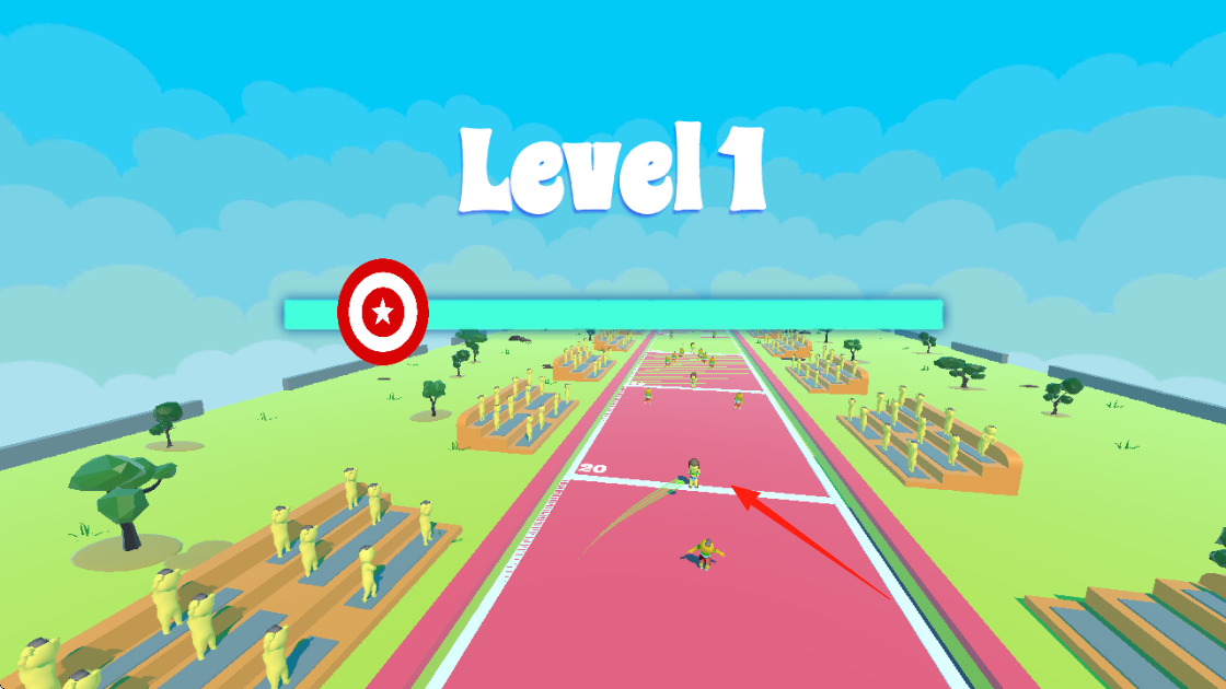 1、关卡目标在“Level1”田径场,控制角色投掷物品(如标枪),需越过跑道上的对手,命中远处目标(红靶心),推进进度条。