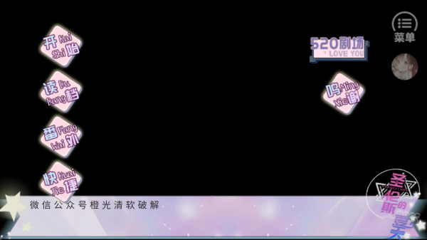 1、主界面点击粉色菱形按钮,【开始】启动新剧情,【读档】延续存档进度,【番外】解锁额外故事,也可进入【520剧场】【哼唱】模块或借【快捷】跳转流程。