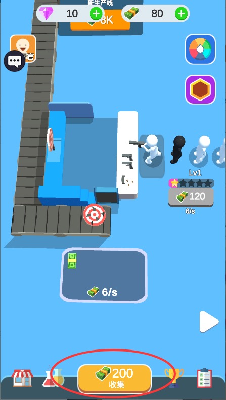 3、定期收取场景中累积的收益金币,积攒足够资金后可解锁更高级别的生产线设施。