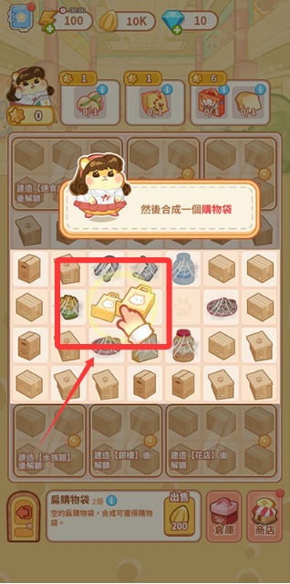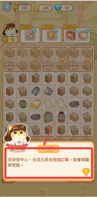 1、在超市的研发中心,我们需要将游戏框内的元素合成来完成订单。