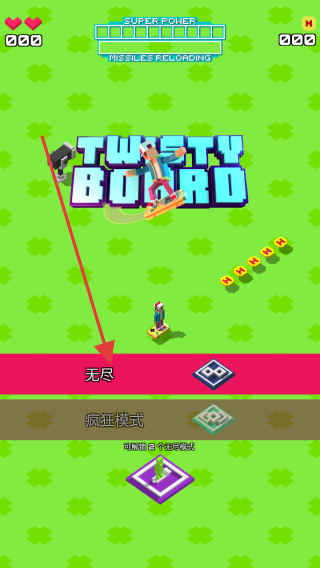 1、选择初始滑板,在像素赛道上滑动屏幕起步,开始躲避首个迎面而来的尖刺障碍。