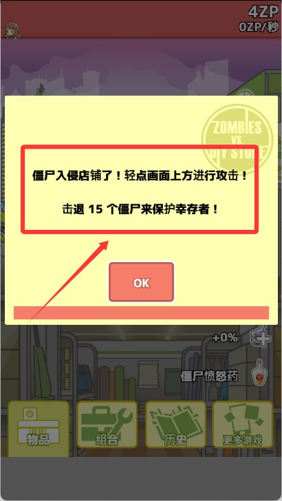 2、僵尸入侵了店铺,轻点画面上方就可以攻击僵尸了