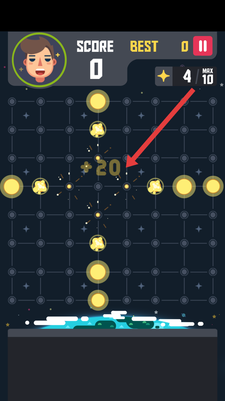 2、在操作中需要形成十字对称的黄色圆环组合,触发爆炸特效,获取【+20】积分,提升SCORE数值。