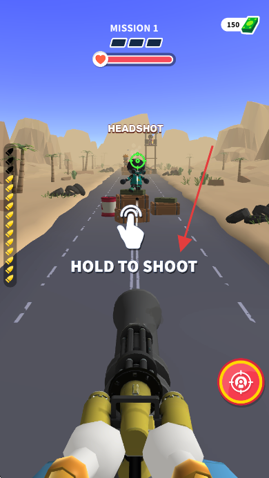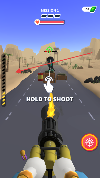 2、在MISSION1中,按住屏幕射击,消灭道路前方的敌人。
