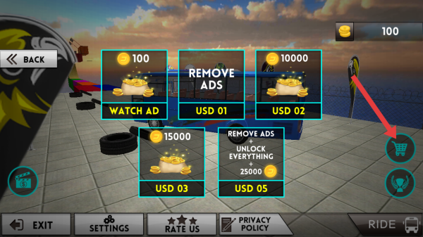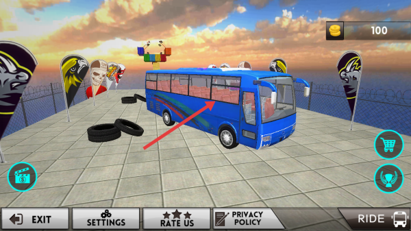 2、进入主界面,点击【RIDE】,驾驶蓝色巴士,开始空中赛道挑战,留意金币(100)。