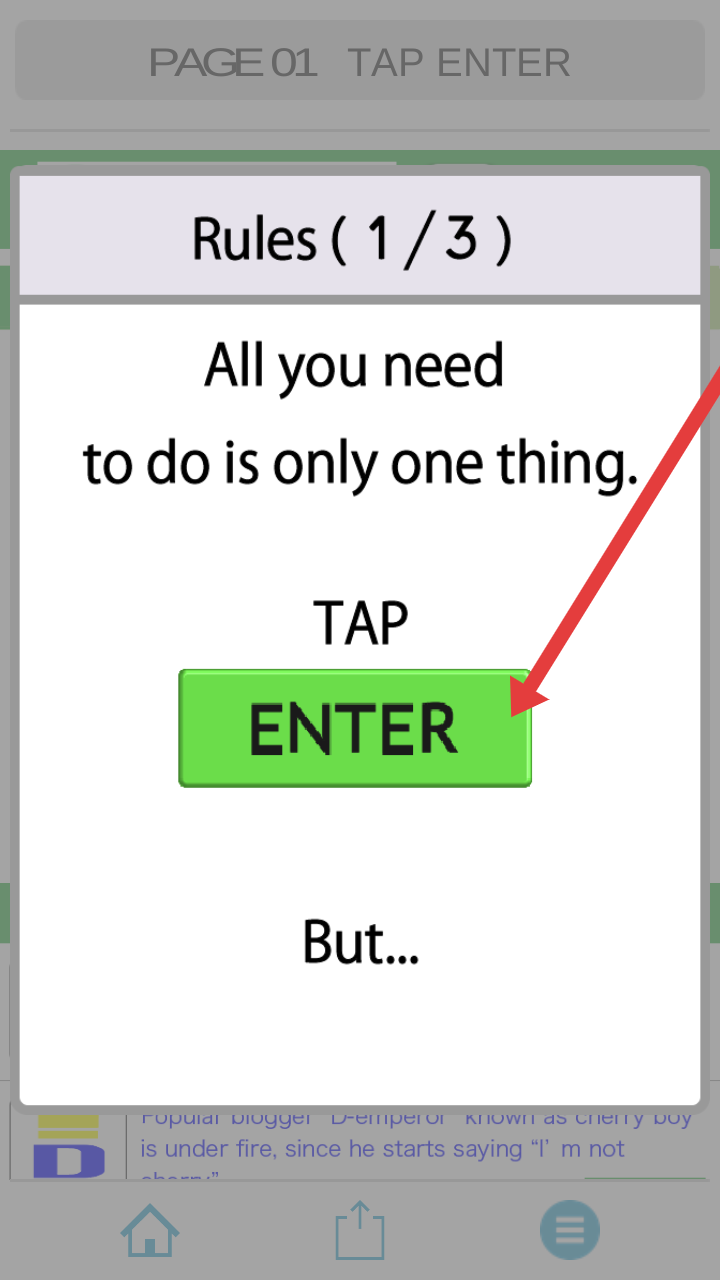 2、在规则说明页(Rules1/3),点击绿色【ENTER】按钮,遵循“仅需点击”的初始规则,推进游戏流程。