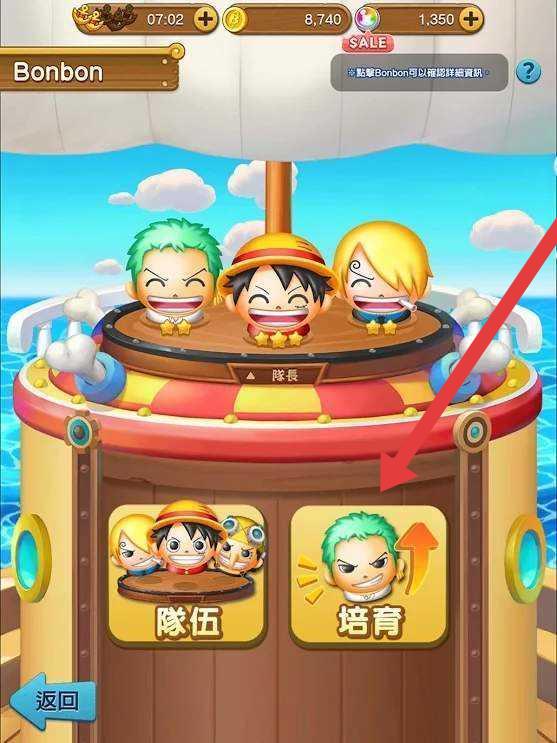 3、进入功能界面,点击【培育】按钮,对角色(如索隆)进行培养升级,提升队伍实力。