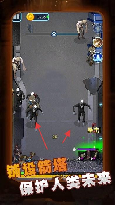 1、消耗金币“铺设箭塔”,在僵尸路径部署防御,攻击来袭僵尸,守护人类未来。