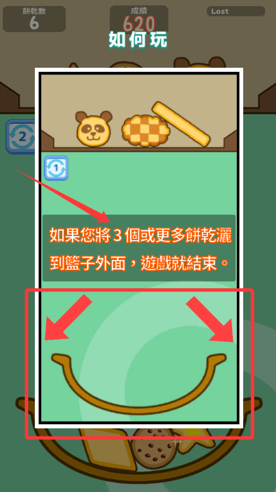 3、注意保持平衡,若有超过三块饼干掉落容器外则挑战立即终止。