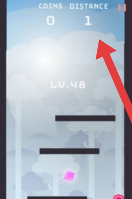 1、进入LV48关卡,操控粉色方块借助黑色横条跳跃,留意间距,尝试收集金币、提升DISTANCE进度。