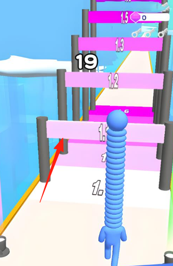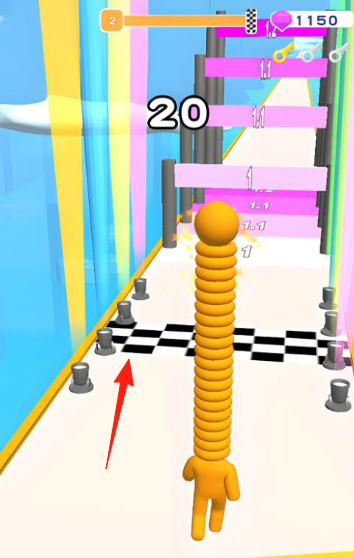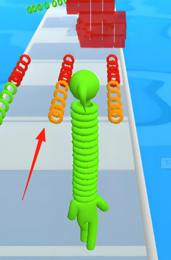 2、遇到弹簧道具列,精准触碰【橙色弹簧环】,增加自身弹簧数量,助力后续闯关句号。