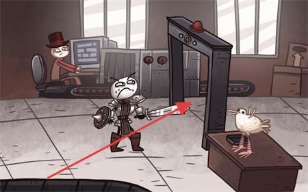 3、来到安检场景,操控身着盔甲、一脸懊恼的角色,利用手中武器道具,对安检处台子上的白色怪鸟做出意想不到的举动,比如让武器与怪鸟产生奇特“互动效果”。