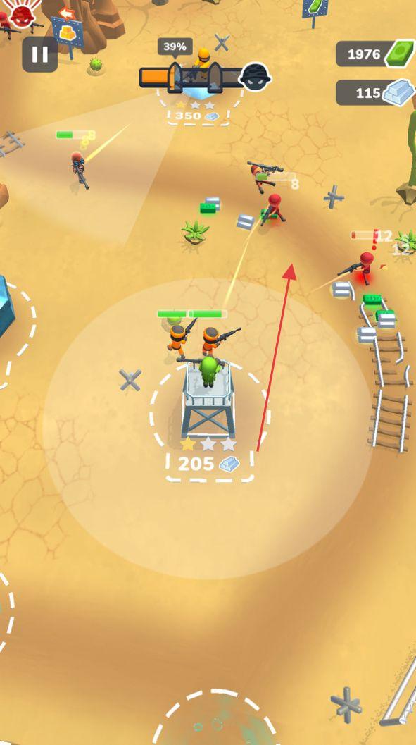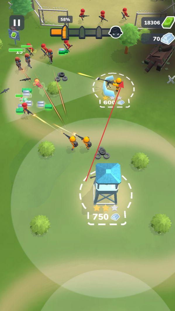 1、在沙漠/绿地战场,指挥橙色士兵部队,利用掩体、塔楼,射击红色敌人,获取资源(绿钞、钻石)。