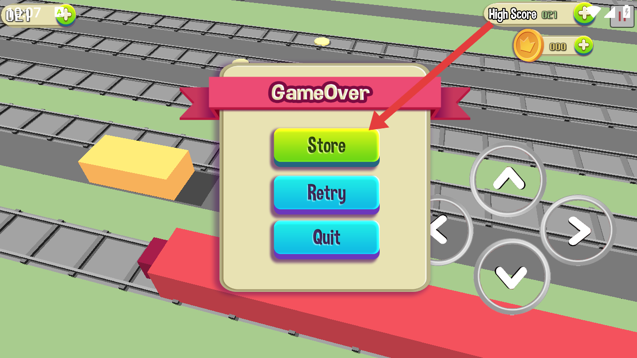 3、在游戏GameOver时,点【Retry】重玩、【Store】强化或【Quit】退出,重复挑战破纪录。