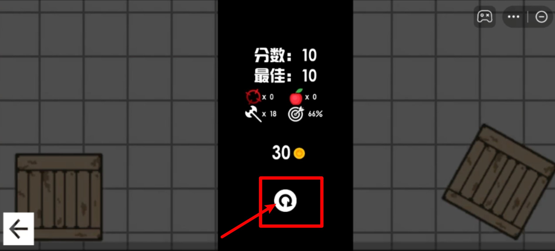 3.结算画面中可查看分数、命中率与剩余资源,点击中间的圆形按钮可以快速重新开始战斗。
