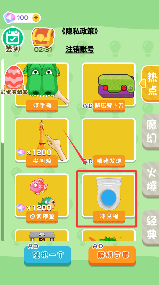 2、从菜单中选择冲马桶小游戏,点击后进入卫生间场景。画面会出现注满水的马桶模型。