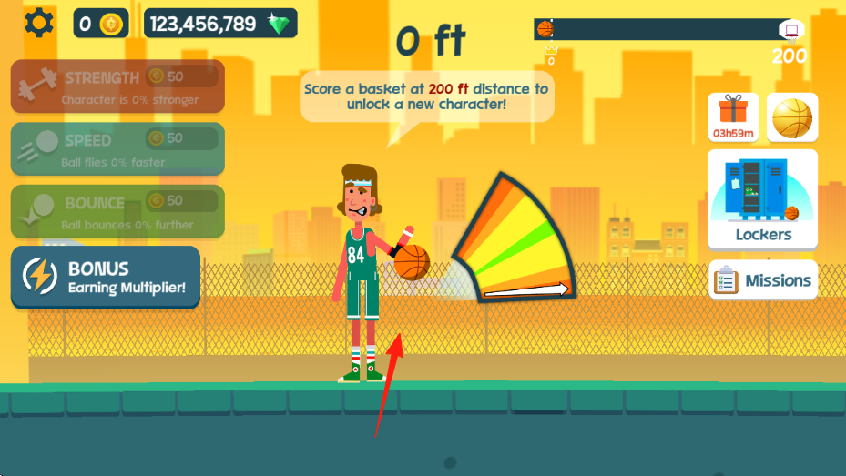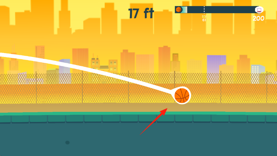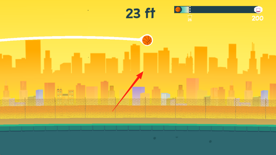 2、投篮后,观察篮球轨迹,在23ft距离时,利用抛物线,让球越过城市背景建筑,向篮筐下落。