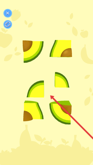 2、需要观察碎片轮廓和位置,按箭头指引,调整碎片方向,精准拼接,还原牛油果。