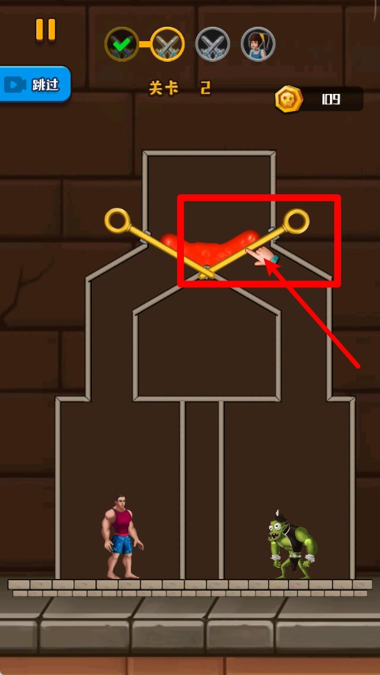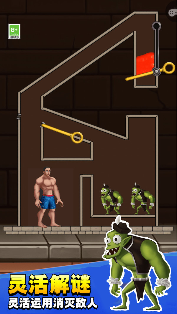 2.点击画面中的金属插销可控制岩浆流向,精准操作让敌人被击败,同时保护火柴人顺利通关并获得金币。