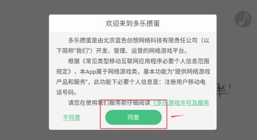 1、首次启动需阅读并确认用户协议,点击同意按钮进入游戏大厅界面。
