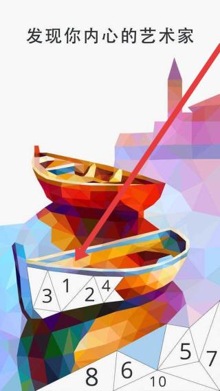 1、进入游戏,根据数字提示(如1-10),点击对应多边形区域,填充颜色,创作艺术画。