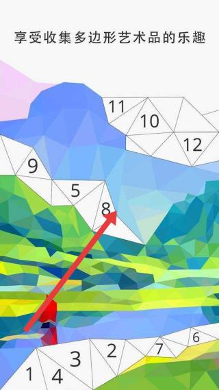 2、在风景关卡,按箭头指引,找到数字“8”区域,填充对应颜色,完成多边形艺术品收集。