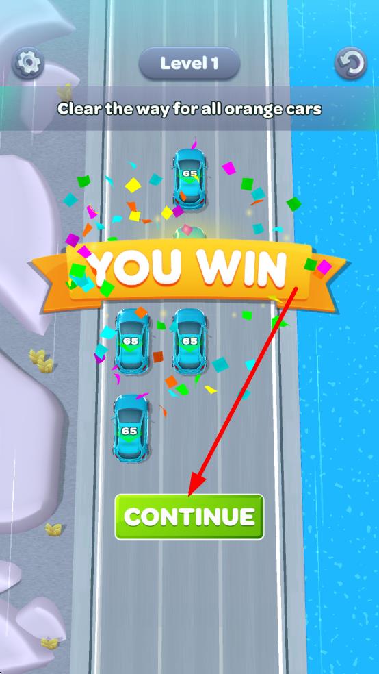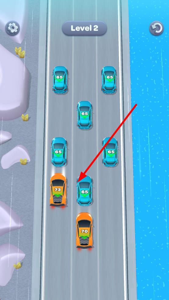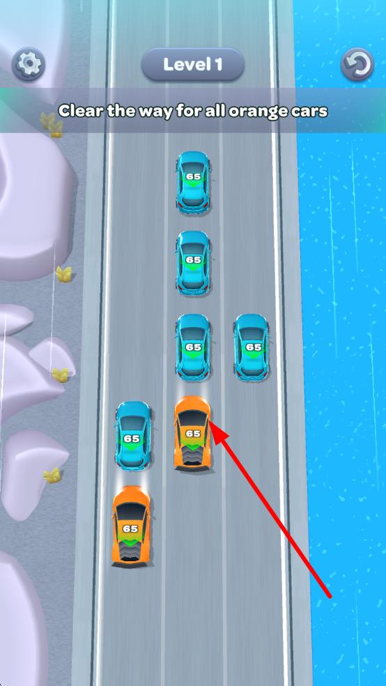 1、进入游戏后,查看初始单车道的汽车分布,通过滑动屏幕移动基础颜色汽车,将两辆同色车对齐完成首次消除,熟悉移动与消除的基础逻辑。