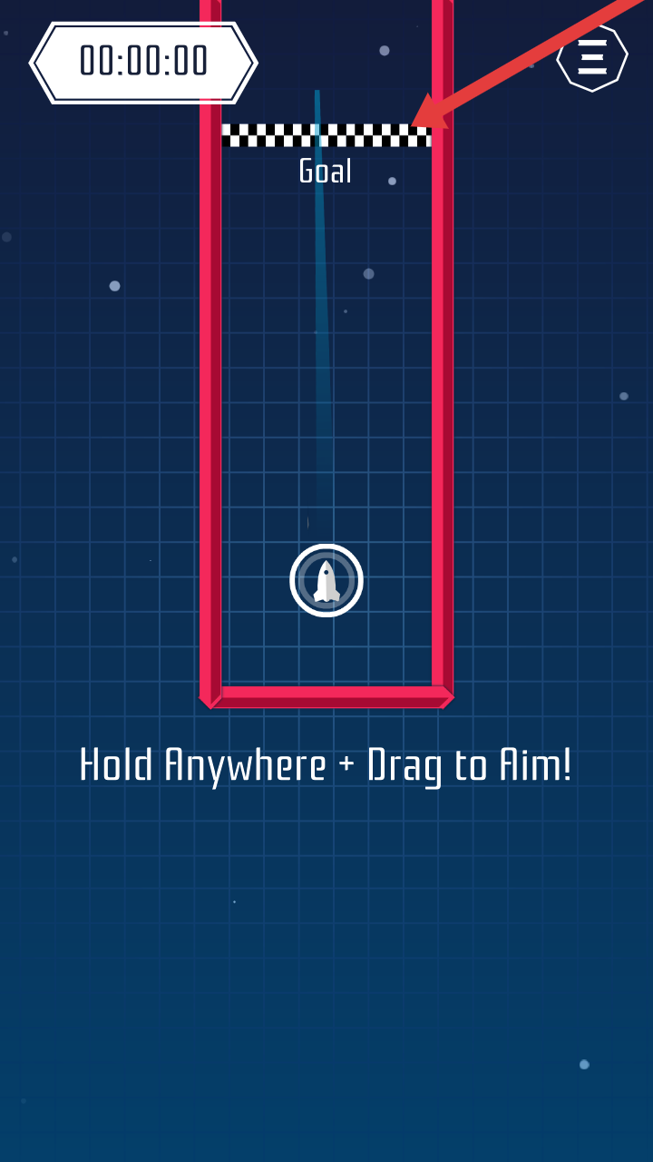 2、在弹射火箭游戏中,按住屏幕任意处并拖动,调整火箭瞄准方向,朝着上方【Goal】区域发射。