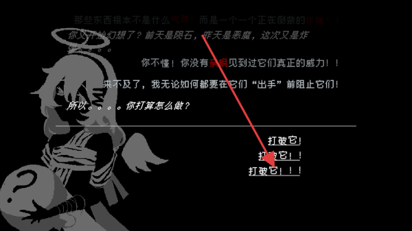 1、游戏内的对话界面,文字围绕“倒数的球(实际是危险物)”展开,有选项“打破它!”等,属于游戏剧情交互内容。