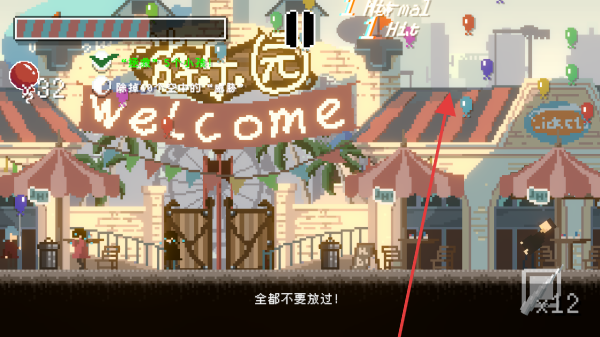 2、像素风格游戏场景,呈现“游乐园(Welcome标识)”画面,有得分“1Hit”等,是游戏关卡场景。