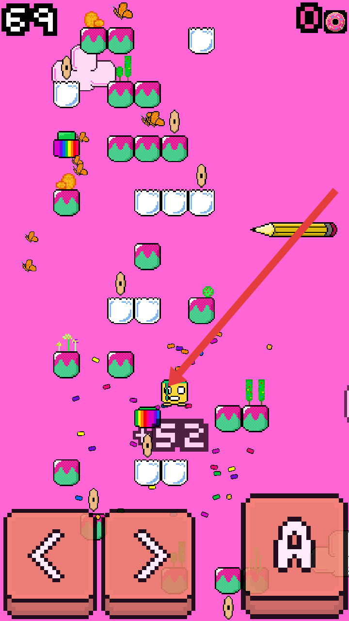 2、游戏中通过底部左右箭头按键控制角色移动,点击右侧【A】键让角色跳跃,收集彩虹道具、甜甜圈等,积累分数(如52)。