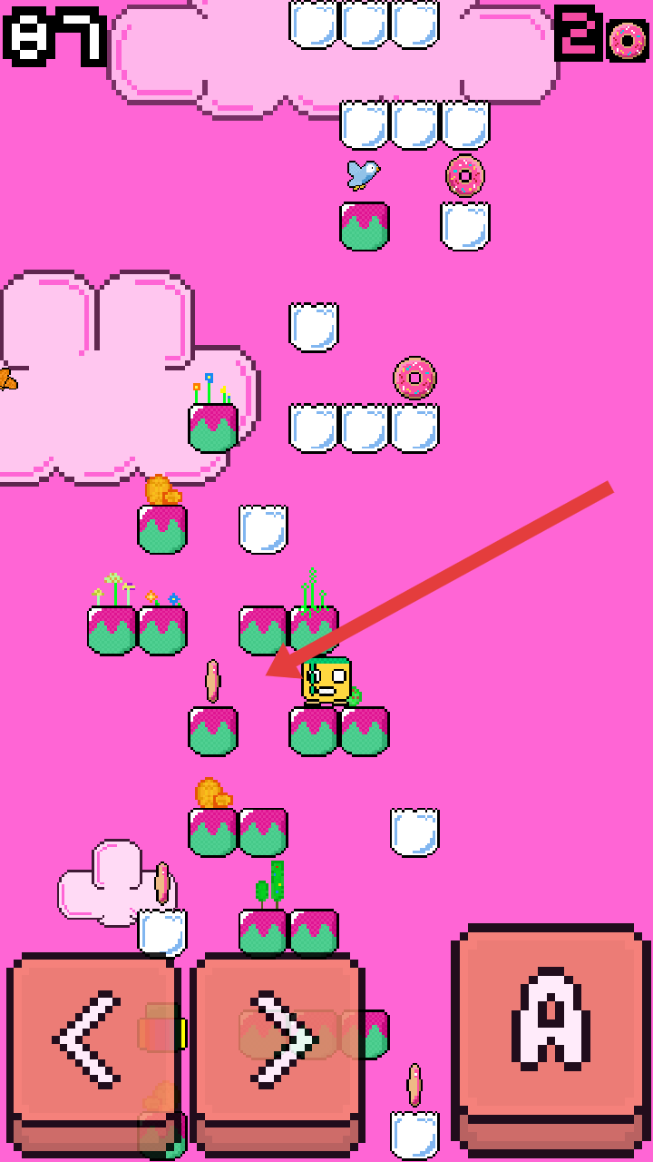 3、持续操控角色跳跃,借助粉色带绿顶的平台向上攀升,收集金币、小鸟等元素,提升左上角分数(如87),挑战更高关卡。