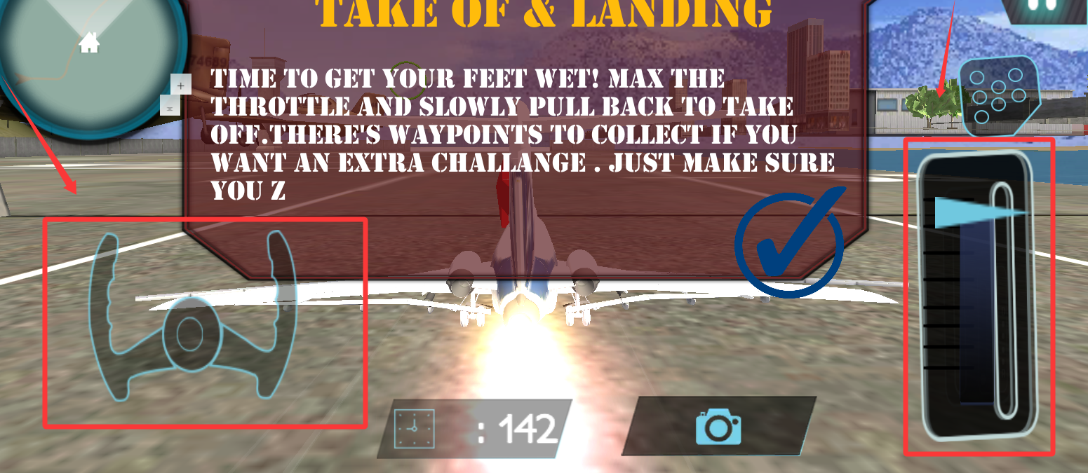 3、左侧虚拟摇杆控制飞行方向,右侧红色按钮负责起飞加。