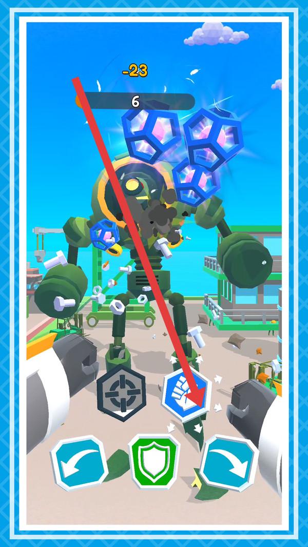 1、战斗时点击下方蓝色拳头图标(红箭头指向),对机械敌人(绿色机器人)造成近战伤害。
