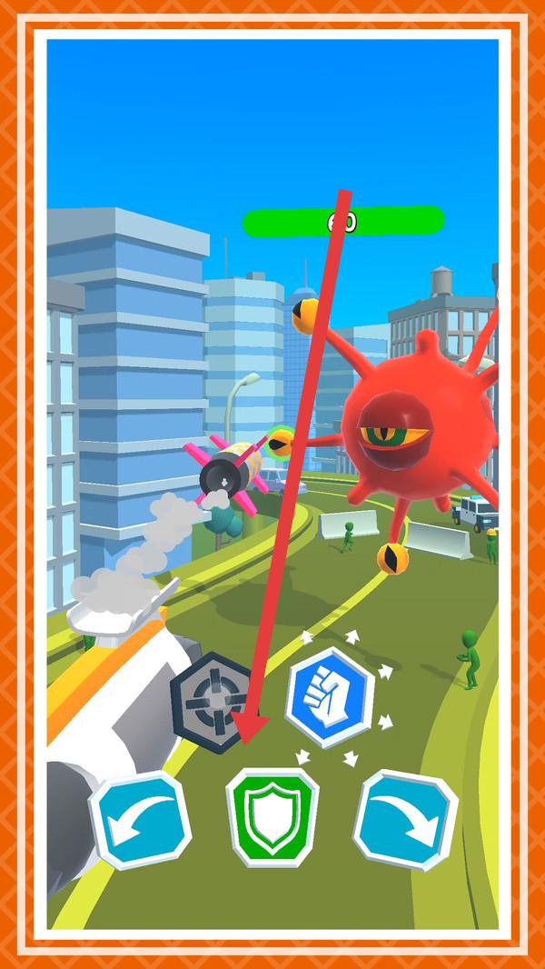 2、面对空中敌人(红色病毒状),使用下方绿色盾牌图标(红箭头指向),抵御攻击,保护自身。