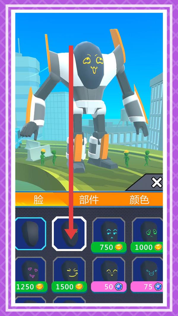 3、在机器人自定义界面,选择“部件”栏(红箭头指向),更换脸部部件(如黄色表情脸),消耗金币。