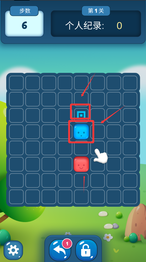 3、需要移动下面红色的方块往蓝色的方块推进去。