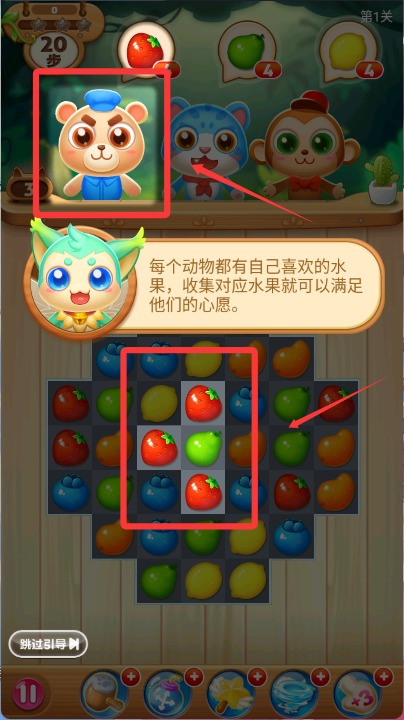 3、开始游戏后我们需要收集每个动物喜欢的水果,收集完成即可通关。