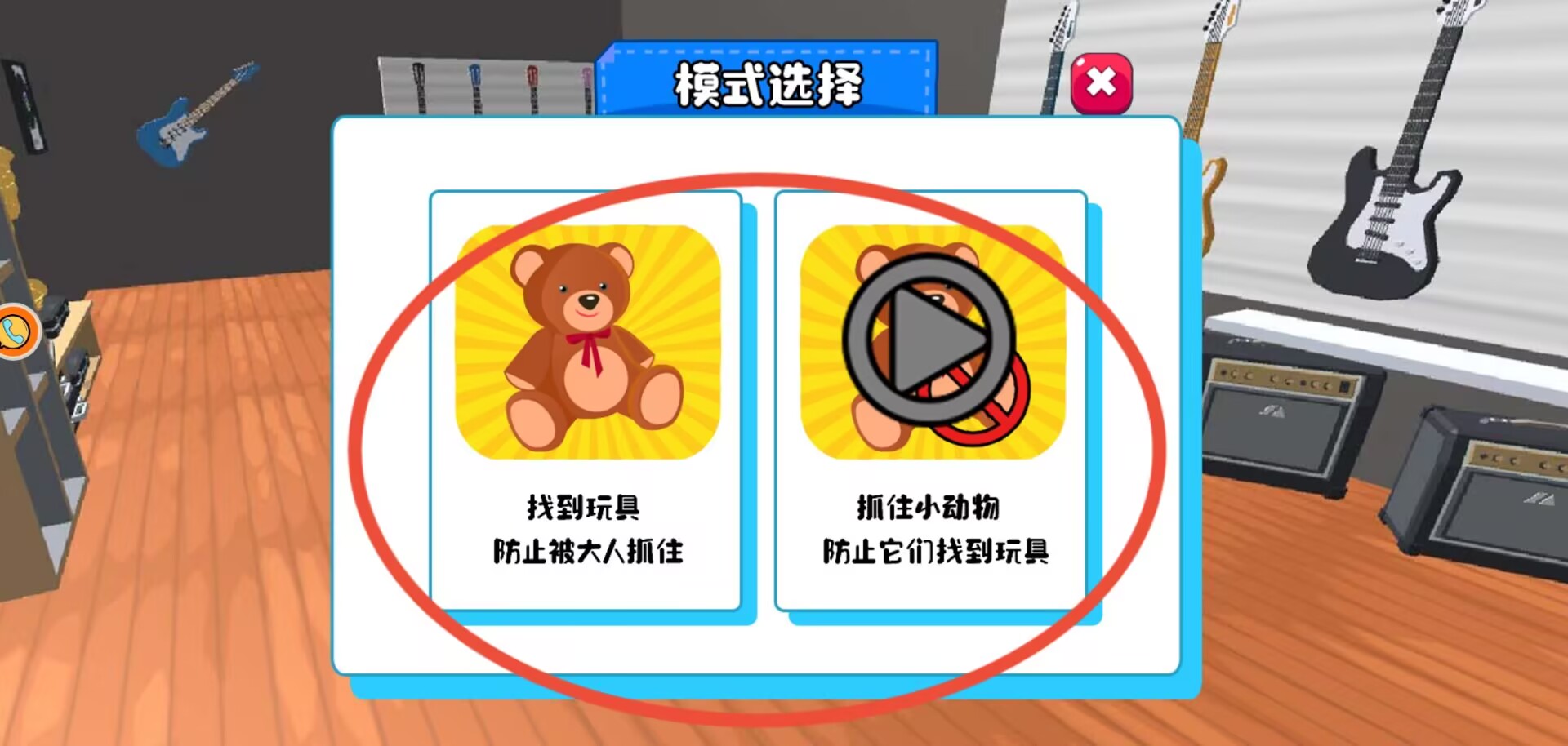 2、游戏模式选择界面提供两种玩法选项,分别为寻找玩具躲避成年和捕捉动物收集玩具两种不同挑战模式。