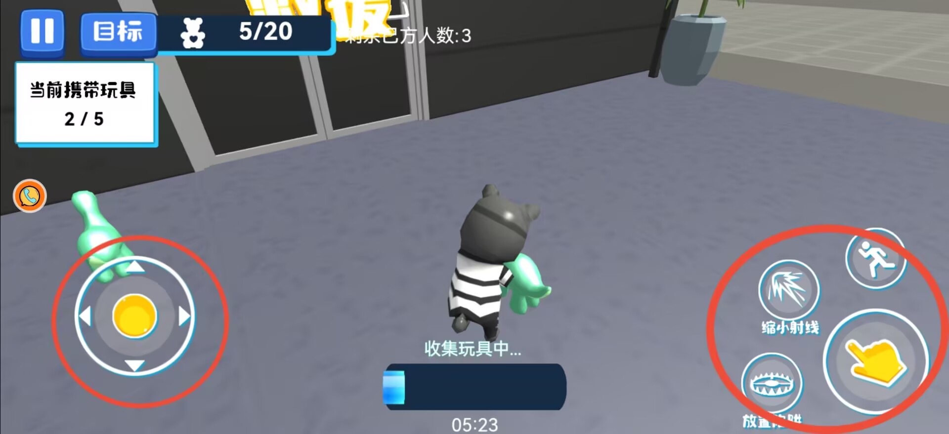 3、游戏过程中界面左上角实时显示任务目标与携带道具数量,操作区域分布左右两侧,包含移动控制与特殊技能按键。