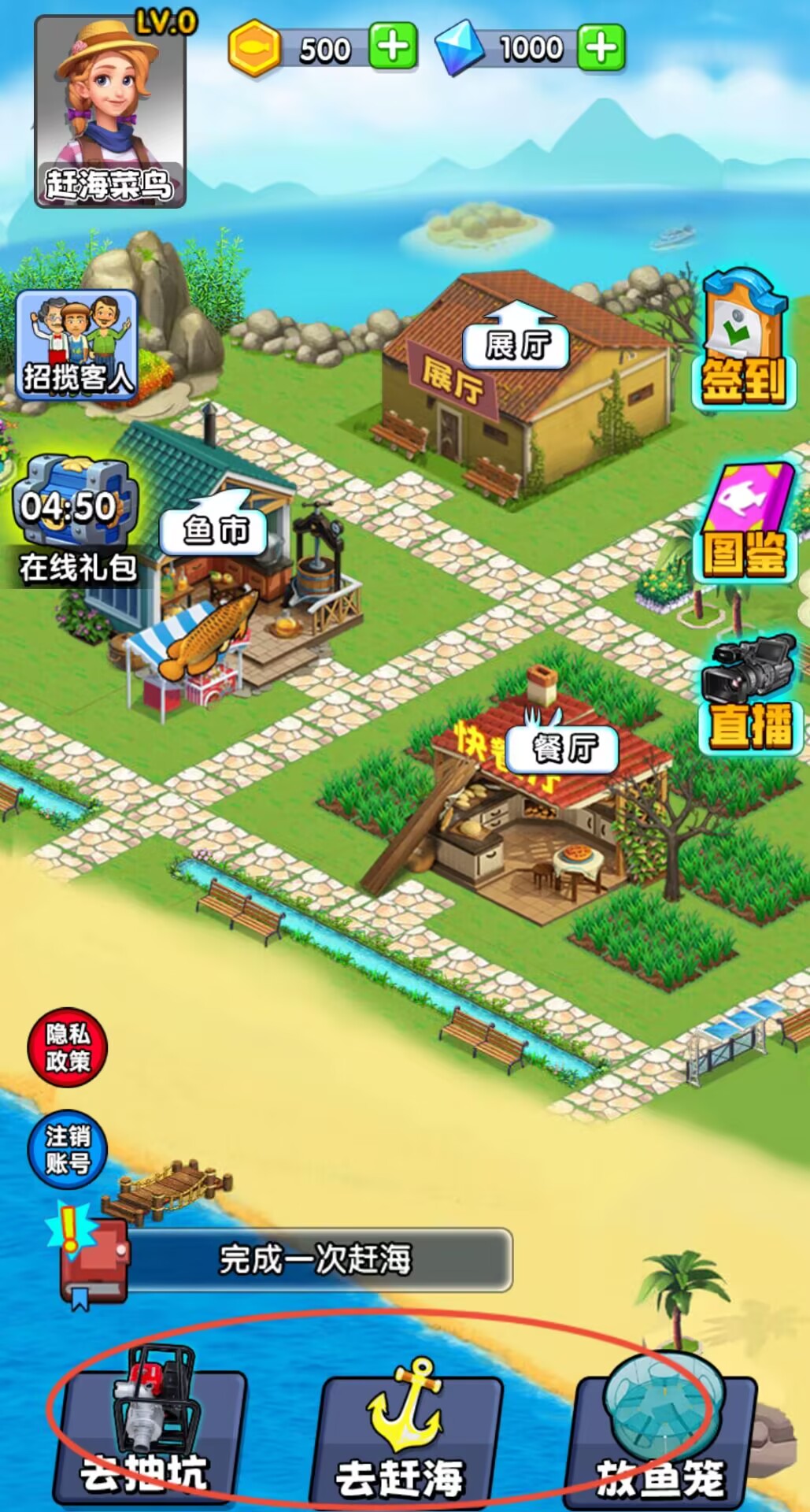 1、左下角为任务列表,底部功能栏包含抽坑、赶海及鱼笼放置等核心操作入口,主界面同步显示餐厅等经营场所。