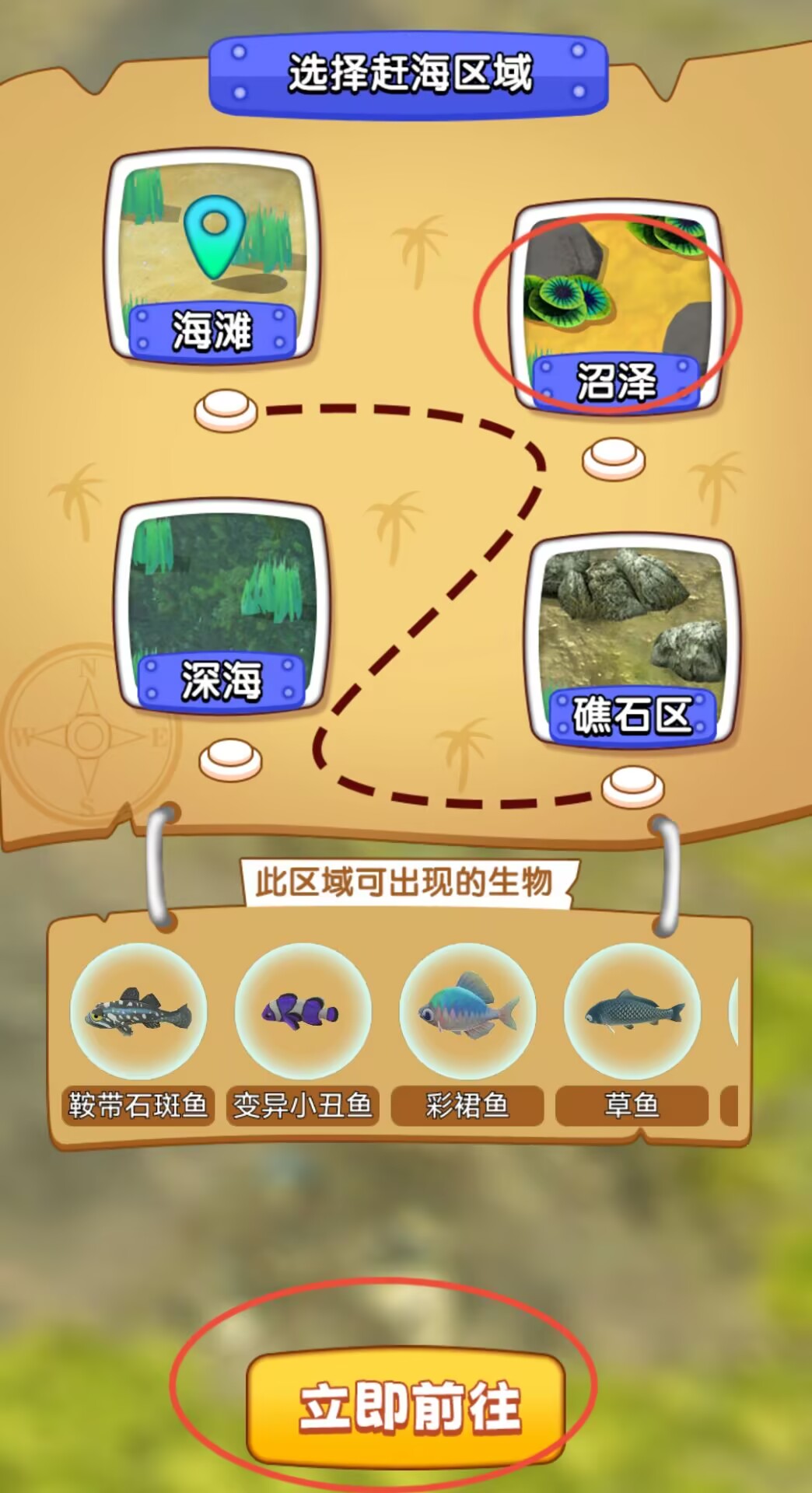 2、选择赶海功能后进入区域选择界面,各海域潜在渔获种类将显示于面板下方,确认目标区域后点击出发按钮开启捕捞。