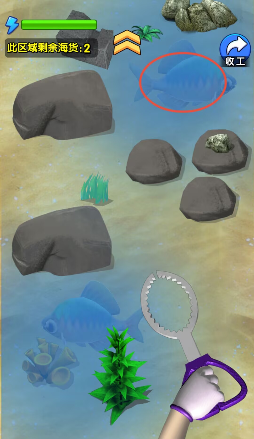 3、捕捞界面左上角实时更新区域剩余海产数量,点击目标生物自动完成采集,结束后通过收工按钮进行打包并返回主界面。