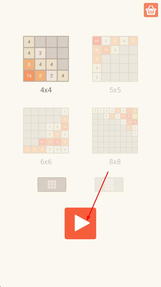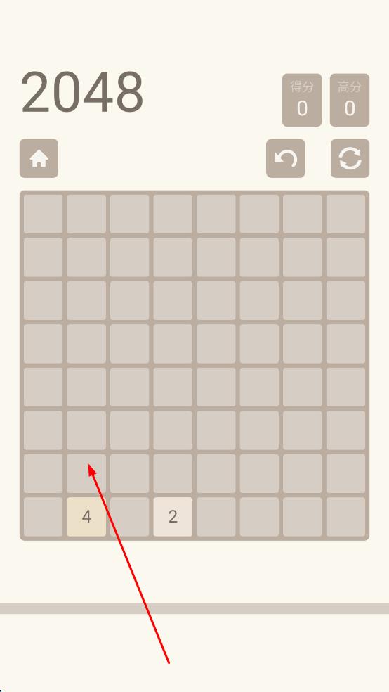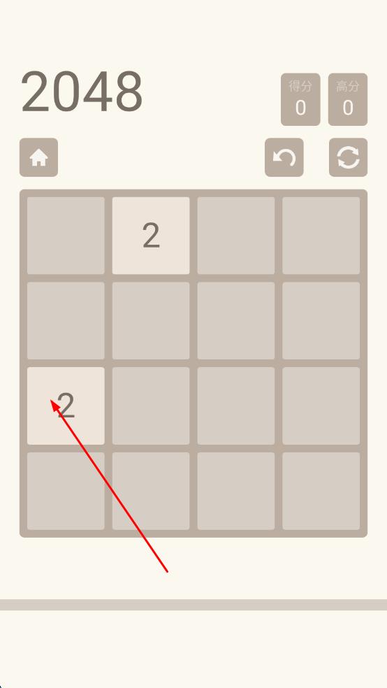 1、进入游戏后,在4×4的方格棋盘上,初始会随机生成2或4的数字方块,通过滑动屏幕(上下左右)使所有方块向同一方向移动。