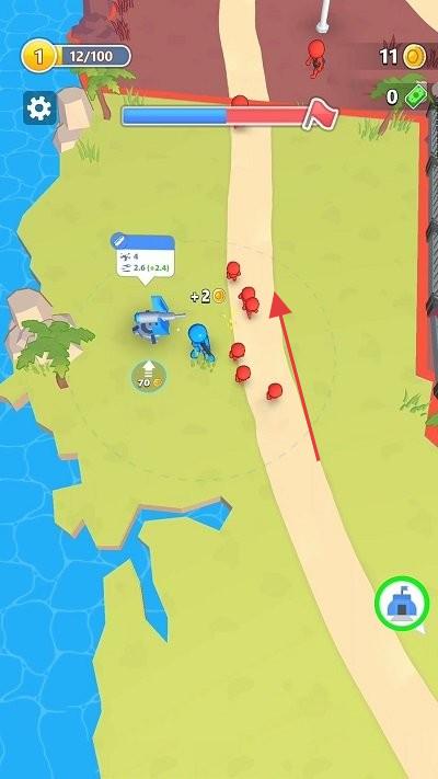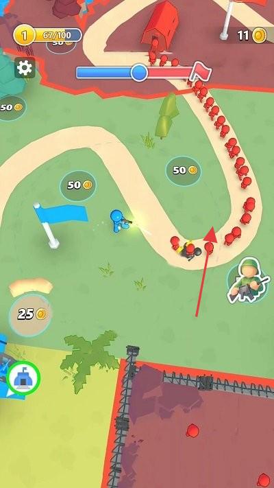 2、规划防御路径,利用兵种(士兵、炮台)特性,阻拦红色敌人沿路径进攻,守护旗帜。