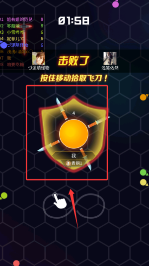 3、通过手指滑动控制角色移动,靠近飞刀时自动吸附收集,长按屏幕可加速冲刺抢夺武器。