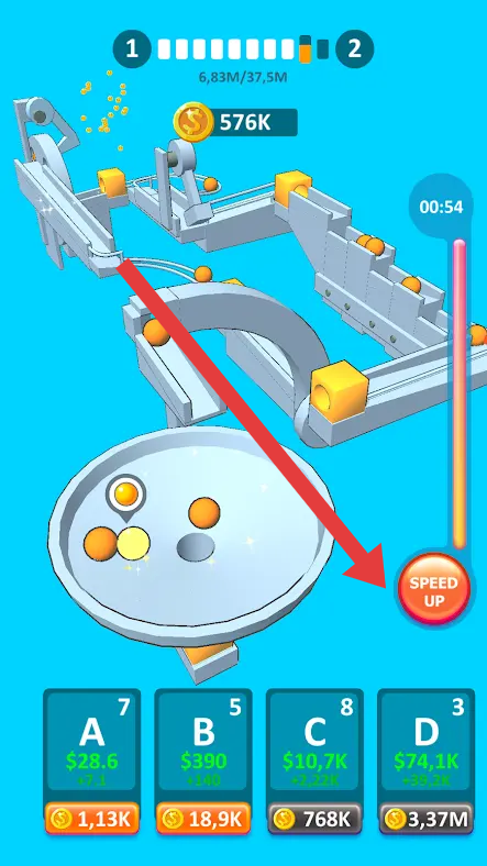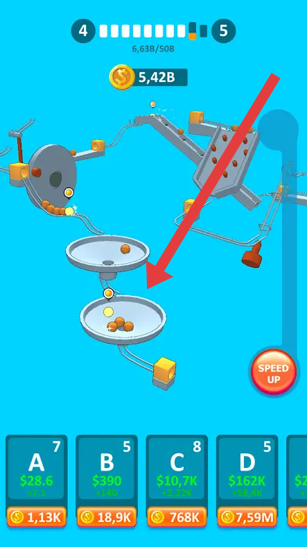 1、工厂界面观察小球生产流程(箭头指向圆盘),确保小球在轨道、转盘顺畅传输,积累金币(5.42B等)。