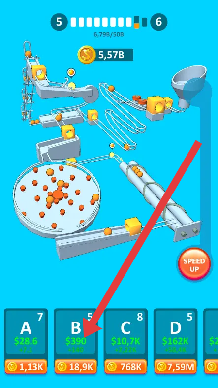 2、点击下方“B”类升级项(箭头指向),消耗金币(18.9K)升级,提升小球生产效率,推进工厂等级(从4-5等)。